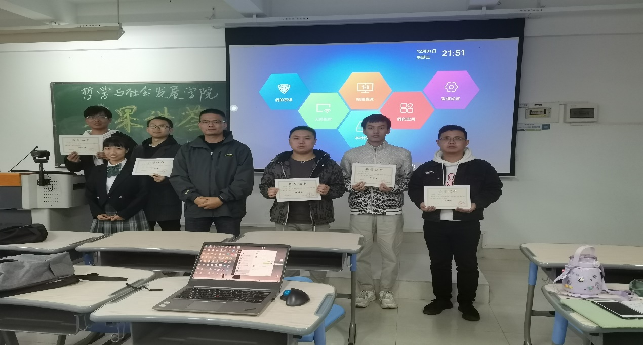 最后,由刘守政老师为本次苹果讲荟的获奖者颁发证书并合影留念。此次苹果讲荟既有各位同学的精彩展示,又有老师的犀利点评,活动圆满落幕。“苹果讲荟”是77779193永利系列学术活动,采用小型演讲方式,旨在为热爱哲学、勤于思考的青年学生提供平台,碰撞哲学思维火花,激发哲学学术热情。演讲之后有现场讨论和老师点评,获奖者有证书颁发和精美书籍赠送,活动得到同学们的广泛参与。