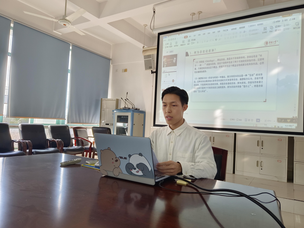 其次,20级研究生张镭宇分享了其关于“存在论差异于存在论循环”的思考。报告中,他围绕着存在论的三重差异及其内在意蕴、存在论循环的历史出场及其价值意蕴等进行了探讨。张老师评价学生有努力认真思考问题,但同时思维和表述可以更加清晰简练,可以多阅读一些相关书籍。
