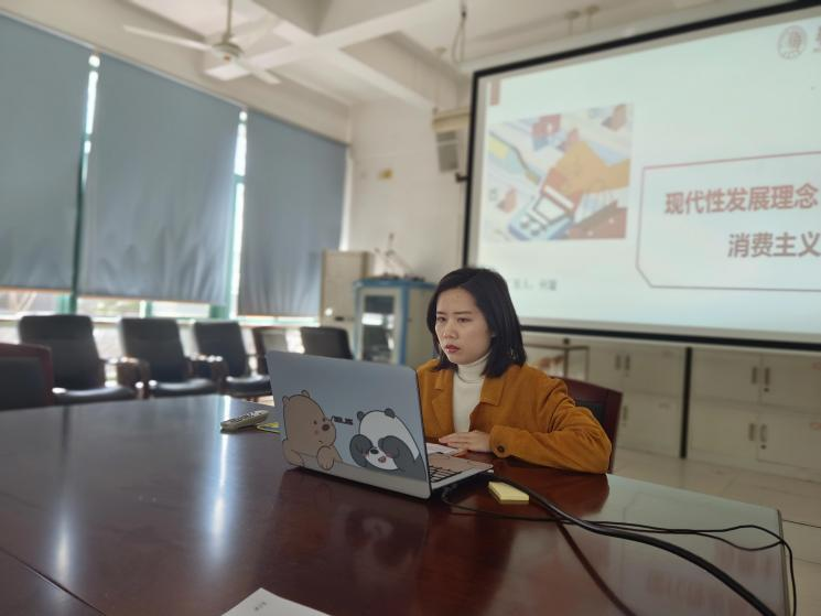 最后,20级研究生何璇做了题为“现代性发展理念:消费主义”的报告。整个报告从消费主义的资本逻辑根源、价值传递:个人主义、当代消费主义新样态、总结几方面进行阐述。老师指出报告比较完整,但要注意区分举例和论证的区别,举例是为了说明,逻辑论证主要分为归纳和演绎,是要增强观点的说服力。