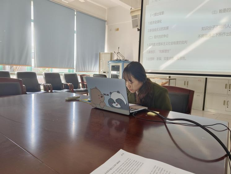 接着,20级研究生刘佳分享了以“鲍曼‘流动的现代性’”为题目的报告。她对鲍曼进行了简要介绍,之后说明现代性提出的背景和存在的争论,并阐释鲍曼关于现代性的观点,最终指出了“流动的现代性”的生存困境并提出了解决对策。张老师点评到,资料收集充分,在参阅材料的时候还需要多总结材料的逻辑,并进行自己的思考和加工,融入自己的想法。