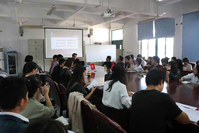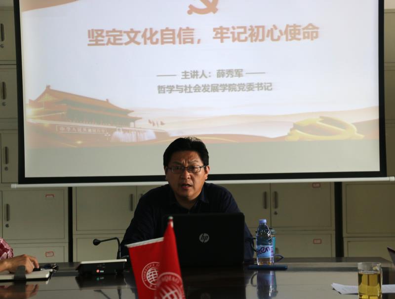 薛秀军从“坚定文化自信,强化初心使命”、“坚定文化自信,实现初心使命”、“坚定文化自信,践行初心使命”三个方面出发,结合自己对习近平总书记相关论述的学习体会和学院发展特别是学院党建工作的实际,围绕中国共产党作为使命型政党的典型代表,要想不忘初心,主动承担历史使命,就必须坚定文化自信展开,对如何坚定文化自信,坚定什么样的文化自信,如何在坚定文化自信中更好地保障和强化党的初心使命的实现等进行了分析和阐释。期间,薛秀军也对当前学院党建工作中的一些重要任务、对党员特别是学生党员的一些基本要求、对前期调研反映的一些问题和建议等做了解释说明。最后,薛秀军强调,作为党员,作为积极向党组织靠拢的积极分子,要想更好地理解和认识党的初心使命,要想更好地践行和落实党的初心使命,就必须要原原本本地读原著,特别要认真阅读领会习近平新时代中国特色社会主义思想的相关论述,加强理论与实际的结合,立足本职岗位,时时处处发挥先锋模范作用,以此,才能更好地为中国人民谋幸福,为中华民族谋复兴,推进中国特色社会主义行稳致远,不断向前。