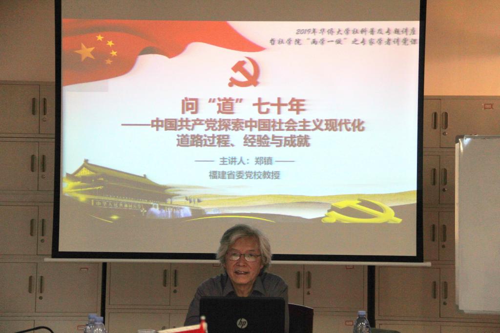 郑镇从“如何发挥社会主义制度的优越性,把一个‘一穷二白’的国家迅速变成一个繁荣富强的国家”,“‘什么叫社会主义、怎样建设社会主义’,如何在改革开放中走出一条有中国特色社会主义的建设道路”,“面对风云变幻的新世纪,如何坚定不移地推进中国特色社会主义向前发展”,“在中国特色社会主义新时代,如何应对国内外风险挑战,打赢改革开放攻坚战”四个问题出发,回顾了中国共产党探索中国特色社会主义道路的曲折历程,分析了历届领导人为中国特色社会主义现代化建设做出的历史贡献,总结了中国特色社会主义现代化探索过程中的经验教训,并结合自身的理论研究分享了自己的见解和体会。郑镇认为,通过新中国七十年的艰辛探索,我们可以发现中国特色社会主义道路生成的内在逻辑。经过七十年艰难曲折的探索,中国已经成功走出了一条具有中国特色的社会主义现代化道路。新中国成立七十年来的历史经验充分证明,中国特色社会主义道路是引领我们实现中华民族伟大复兴的唯一正确道路。改革开放是决定当代中国命运的关键一招,是实现中华民族伟大复兴的必由之路,正确认识和把握当代世界发展潮流,是打赢改革开放攻坚战的关键。