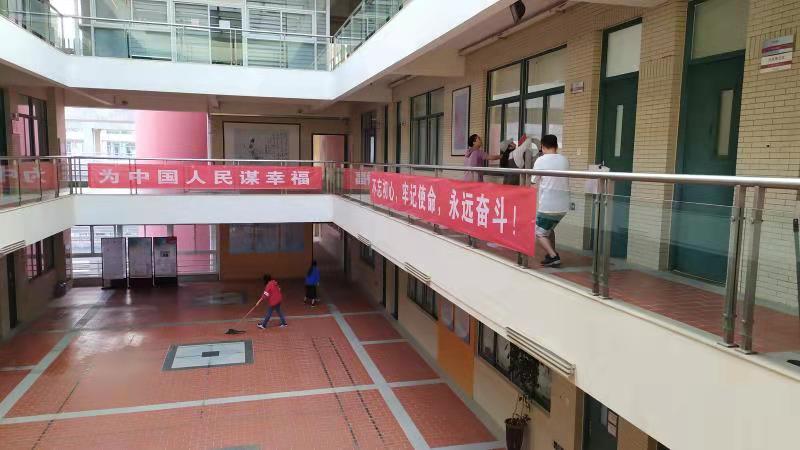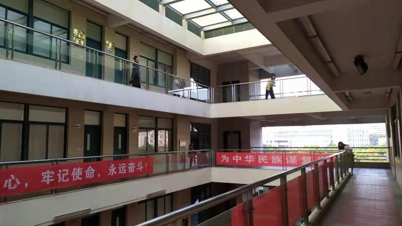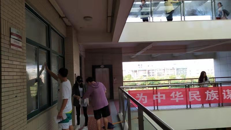 三个学生党支部成员按照之前协商好的职责范围分别负责打扫一个楼层的公共卫生。大家扫把、抹布、水盆齐上阵,走廊、门窗、围栏共忙碌,有组织、有分工、有成效地将学院上下打扫得焕然一新。