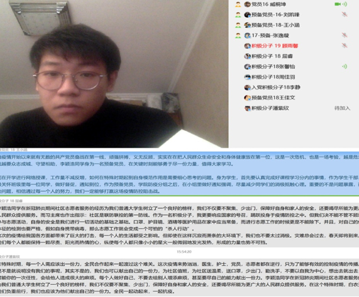 哲学一组于2月25日下午,在网络会议中首先对我院社会学系预备党员李颖浩同学积极投身疫情防控志愿工作的先进事迹进行学习,党小组成员分别发表学习感想以及就疫情期间学习与生活中如何起到模范作用的认识,大家纷纷表示,学生党员作为学生团体中的先进分子,一定要坚持做到不信谣、不传谣,规范自身的言行,模范遵守疫情防控的相关纪律和要求。会议最后,党小组组长简要询问了解了大家目前的学习以及生活情况,对本小组后续工作做了初步的安排。