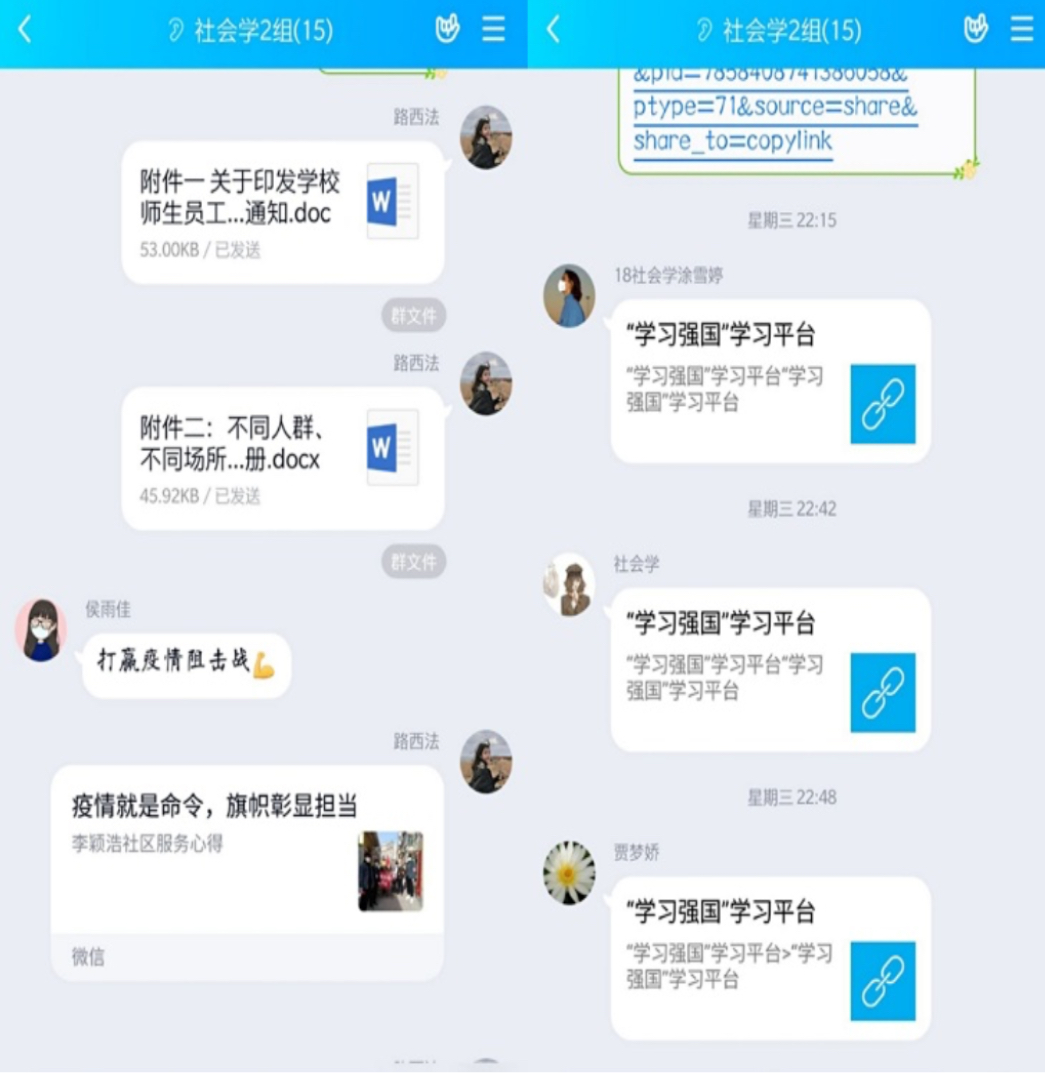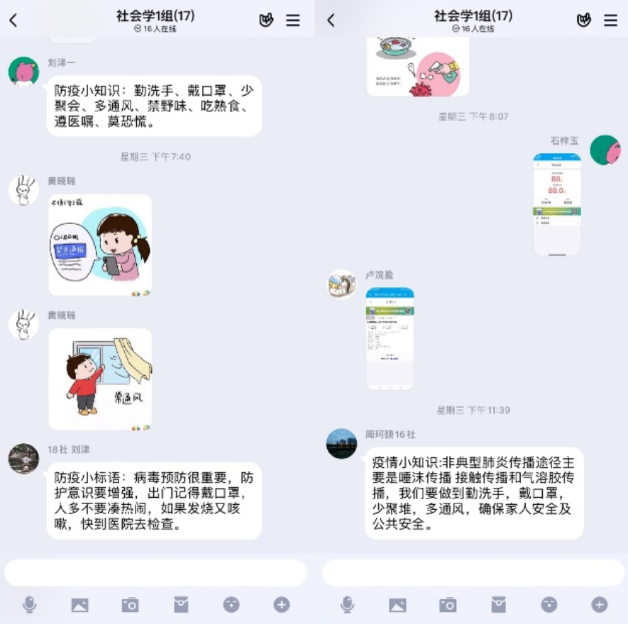 社会学一组2月25日上午在QQ群中组织开展了线上主题党日活动,组织大家积极参与了易班疫情防护知识答题,并相互交流学习防疫知识与心得。大家表示,在防疫工作中应从我们自身做起,充分发挥每位党员的模范带头作用,众志成城,坚决打赢疫情防控阻击战!