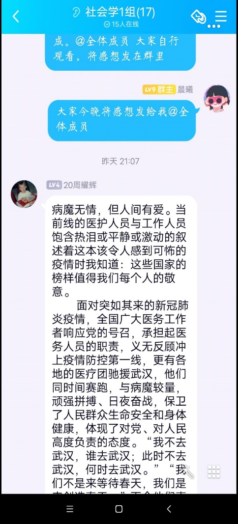 社会学1组入党积极分子杨德远表示:榜样的力量总是比书本上的励志名言更加让人深刻,在疫情暴发的时候,他们毅然冲向前线,为疫情防控工作贡献了自己最大的力量,到底是什么力量在支撑着他们,我想,这背后一定有党员这个庄严的身份使得他们克服了恐惧,忘记了疲惫,全心全意地在为人民服务,在中国共产党的带领之下,全国各族人民团结在一起,积极配合疫情防控工作,使得这场无声的战争取得胜利,这其中党员们传达出的艰苦付出,勇于担当的精神是永远值得我们学习和借鉴的。