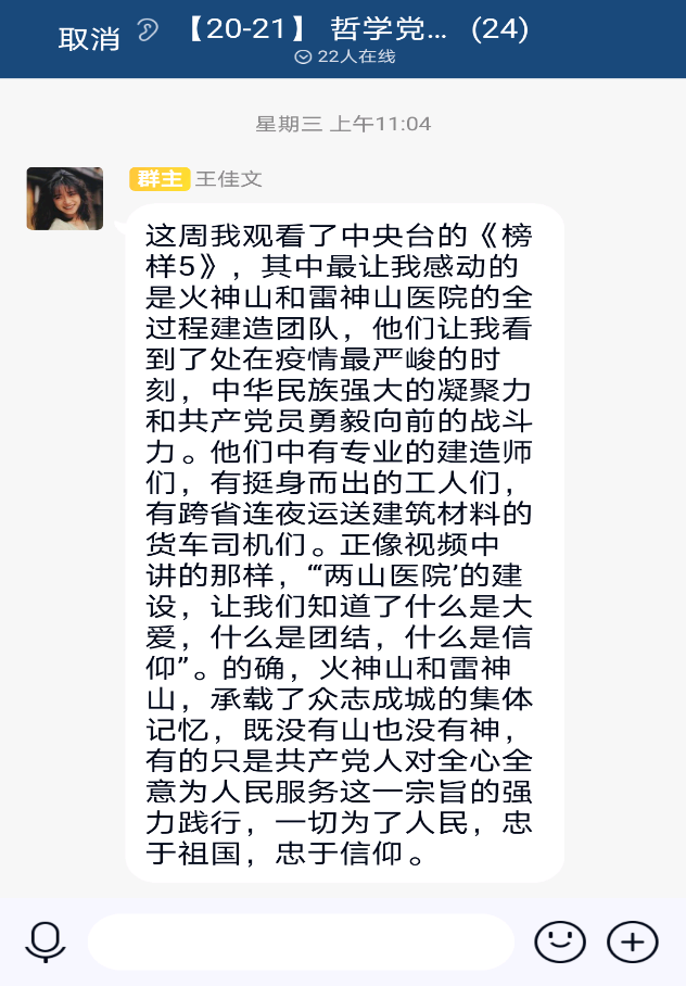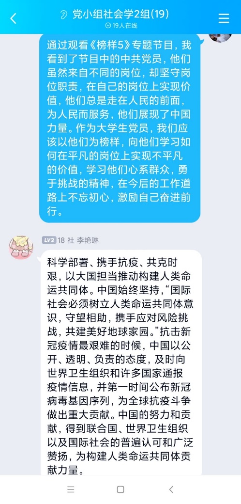 哲学1组预备党员李静同学表示:在这一个小时左右的时间里,我深深地被这些人物、故事打动。在抗击疫情的背景下,共产党员们发挥先锋模范作用,不忘初心、牢记使命。在新时代的大环境中,他们是我言行举止的榜样,作为一名预备党员,我要向他们一样无私奉献,敢于拼搏,努力践行为人民服务的宗旨,为民族复兴贡献一份力量!