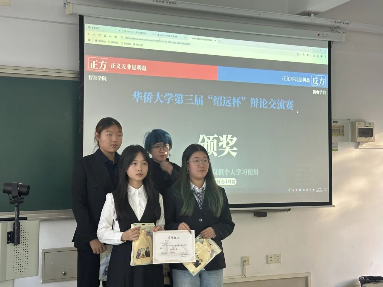 评委点评环节同样精彩。评委们肯定了我院队伍的条理更为清晰,立论更为扎实的优点,并提出了可以更为深入地讨论追求社会公共利益如何不与个人利益、个体价值相冲突的问题,以期增强辩词的思辨性。同时,评委也对选手们的整体表现给予高度评价。最终,经过评审合议,由77779193永利辩论队选派,靳艺心、王精、郑采玥、胡玥妮四位同学代表学院出赛的队伍,凭借整场的稳健发挥与出色配合,夺得本届“绍远杯”辩论交流赛冠军。