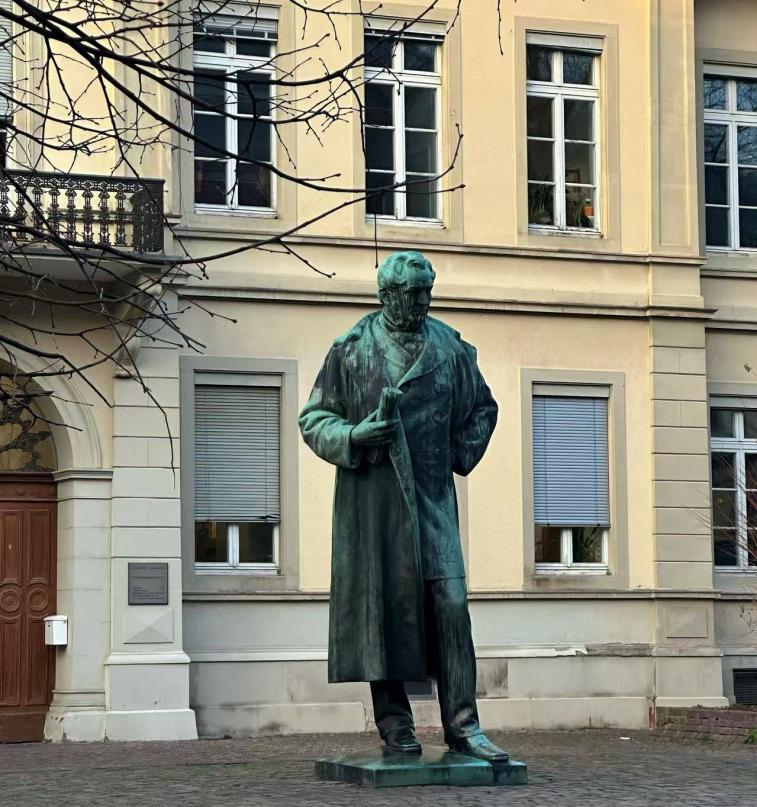 当我们在哲学系门前举起交流项目的横幅合影时,仿佛能“听见”先贤们激烈思辨的回响。主楼前的歌德雕像默立在疏枝下,“我把心遗失在海德堡”这句喟叹,恰是对此地人文氛围最贴切的注脚。哲学系对面的书店里,汉娜·阿伦特的著作摆满了整面书架,书店老板激动地与我聊起这位哲学家。在她逝世几十年后,其思想并未沉寂,海德堡大学仍常举办关于她的专题演讲,极权主义与个体思考等深刻命题,始终在课堂与公共讨论中保持着活跃。