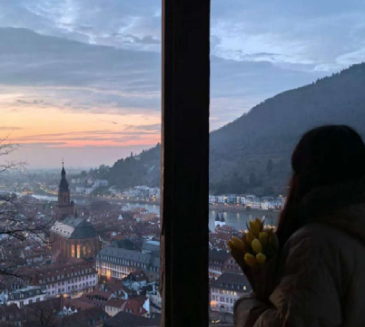 课后,我沿着哲学家小径漫步。青苔裹着石墙,碎阳漏过藤蔓,陡峭的坡度让每一步前行都像在“思想攀登”。站在海德堡城堡的观景台俯瞰全城,薄雾里的内卡河如银带般环绕红瓦屋顶,蜿蜒流淌着。古老建筑与现代楼宇在晚霞中和谐相融,恰如这里的教育理念——厚重却不刻板,传统却不封闭。