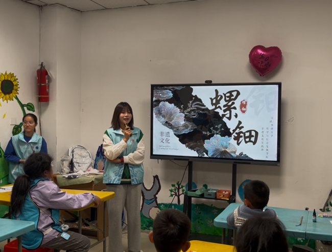 活动现场,实践团成员以图文PPT以及科普视频为载体,用生动易懂的语言为小朋友们讲解螺钿工艺知识,从螺钿的历史渊源、文化价值,到贝壳选材(强调本地可持续采集与海洋生态保护)、传统镶嵌技法,让孩子们系统了解这门千年工艺的匠心之美,沉浸式感受“点贝成锦”的东方美学底蕴。