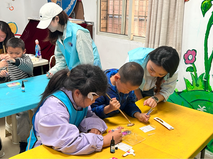 随后小朋友开展DIY体验,志愿者分组指导,孩子们用镊子将贝壳片嵌入图案轮廓,独立完成小幅螺钿作品,在志愿者的耐心帮助下,定格下这场“非遗”与童心碰撞的美好瞬间。