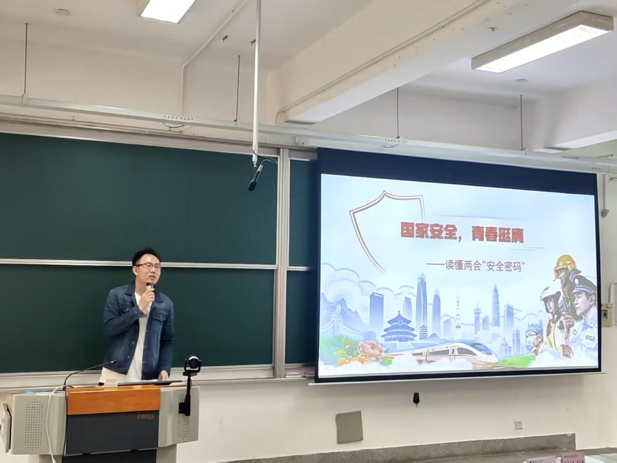 董慧鹏老师以2026年以来美伊地区的紧张局势及安全博弈为切入点,深刻剖析国家安全在国际博弈中的核心地位。结合今年全国两会精神,董老师强调,从美伊战争的历史教训到两会的战略部署,充分印证国家安全始终是国家发展的“压舱石”、人民幸福的“稳定器”。随后,董慧鹏深入阐释国家安全与我们每个人的紧密关联。他结合校园生活与社会场景多个维度,剖析身边随处可见的安全风险。他特别指出,今年两会着重强调统筹发展和安全,这一理念落实到青年层面,就是要树立"国家安全无小事"的意识,认清国家安全早已超越传统军事、政治范畴,渗透到学习、工作、生活的方方面面。