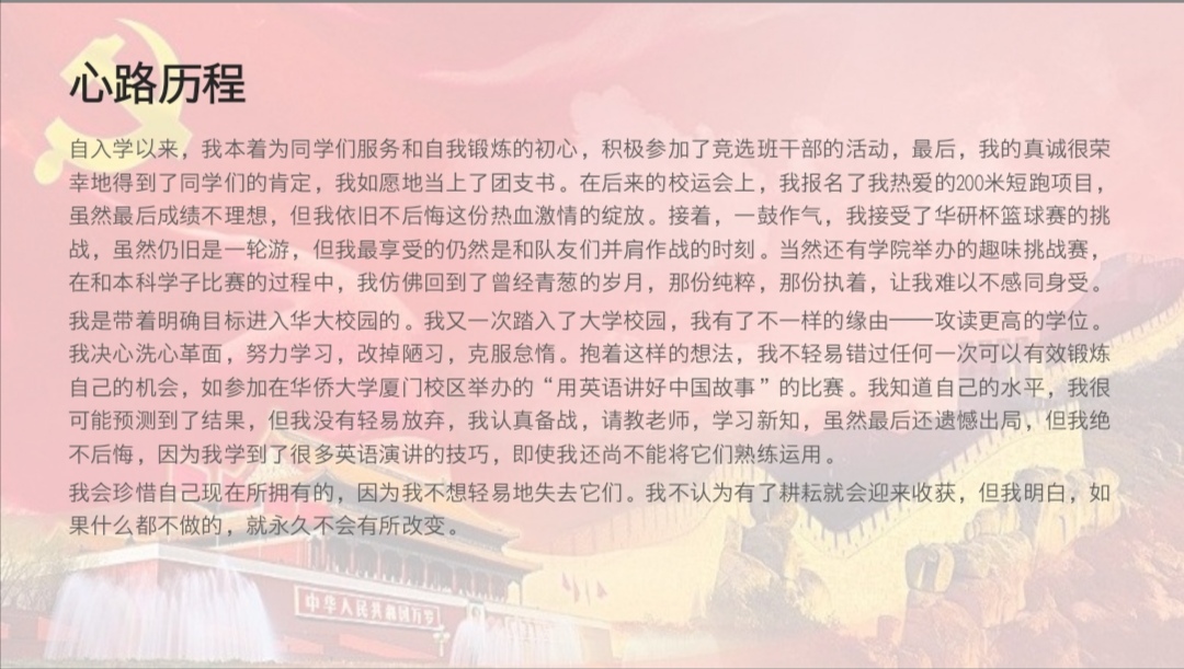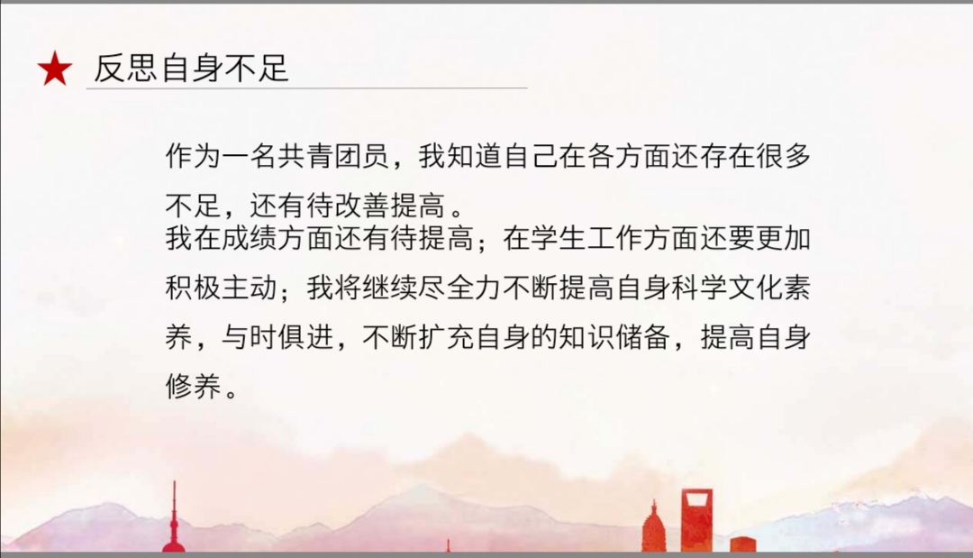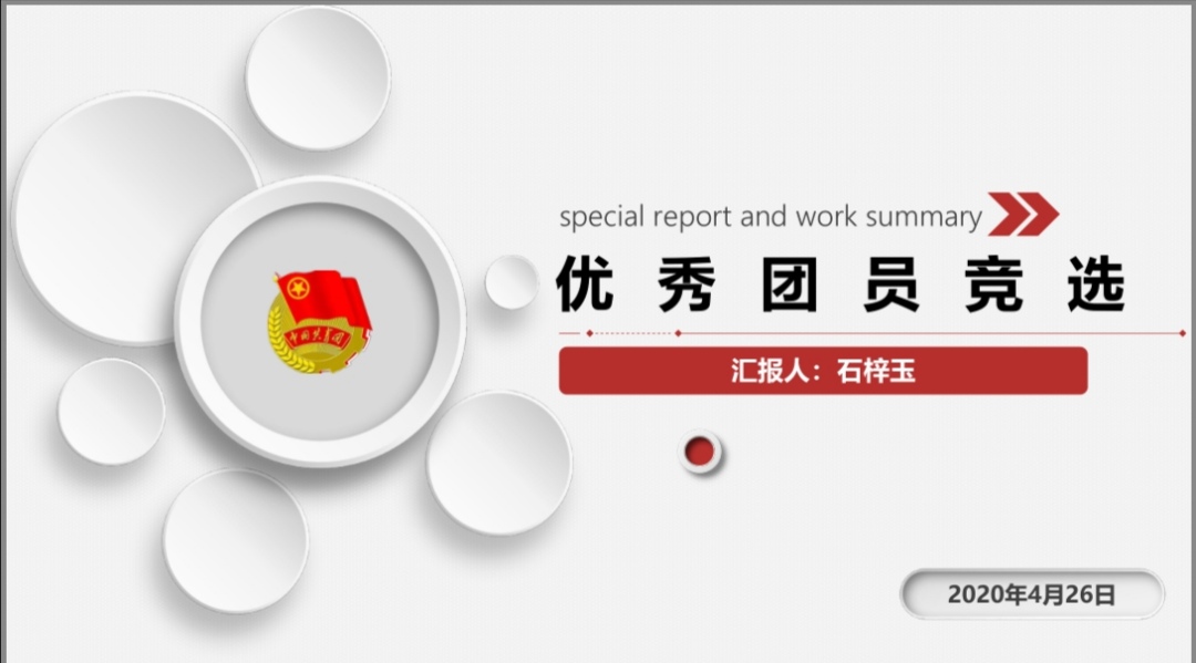 在主持人宣布会议流程和评选规则后,大会正式开始,本次大会共有4个团支部、4名团干部以及11名团员分别竞选“五四先进团支部”、“优秀团干部”和“优秀团员”,采取个人候选人汇报和先进班级团干述职的方式进行评比。本次团支部评选以政治能力、组织建设、班子建设、工作效果为考察重点;团干述职则围绕着理想信念、心系青年、模范作用、工作能力以及工作作风等展开;优秀团员汇报则侧重于考察理想信念、道德品行、模范作用、履行团员义务等。