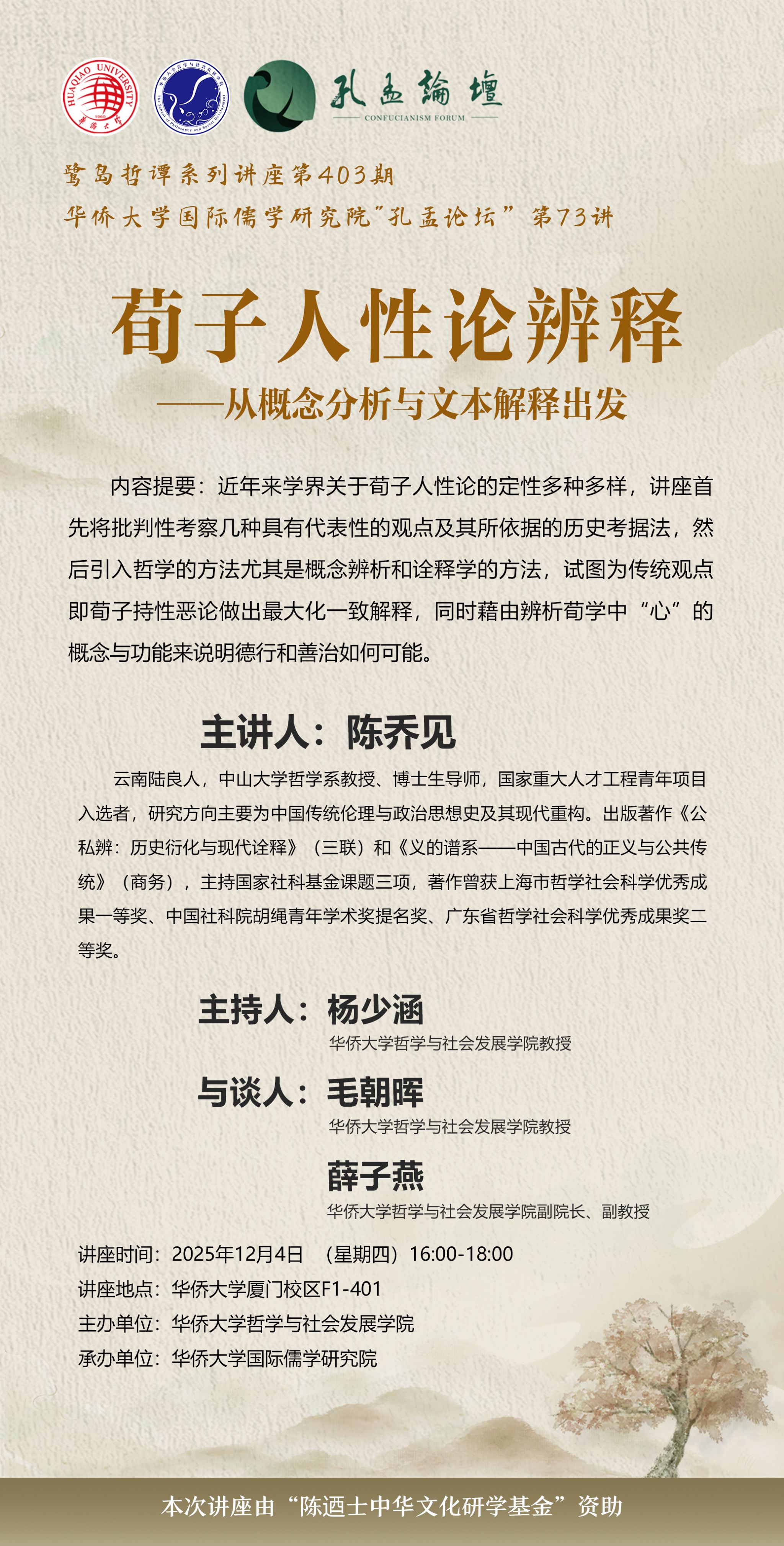 【讲座预告】鹭岛哲谭系列讲座第403期暨永利集团国际儒学研究院“孔孟论坛”第73讲之荀子人性论辨释从概念分析与文本解释出发