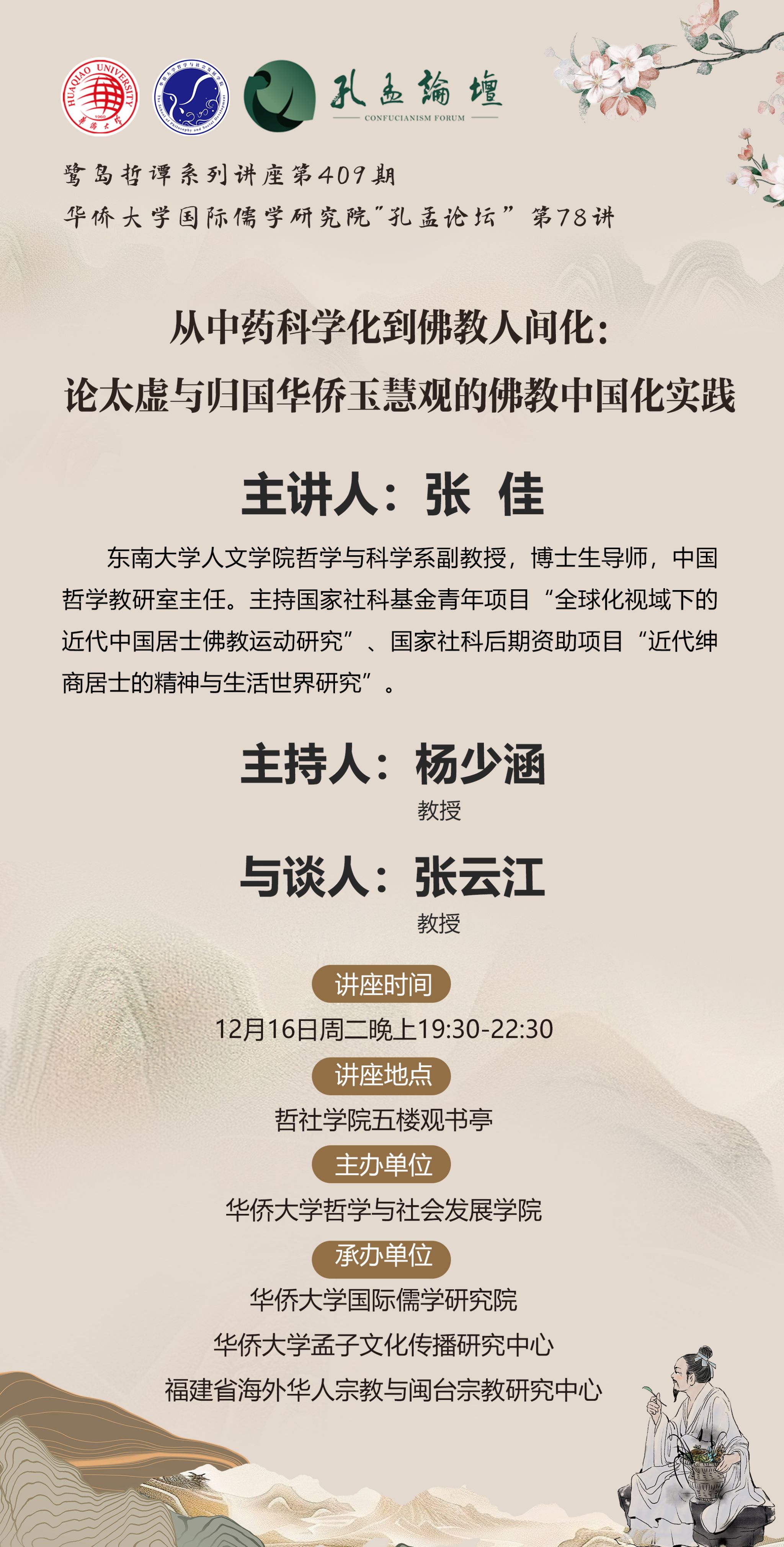 【讲座预告】鹭岛哲谭系列讲座第409期暨永利集团国际儒学研究院“孔孟论坛”第78讲之从中药科学化到佛教人间化:论太虚与归国华侨玉慧观的佛教中国化实践