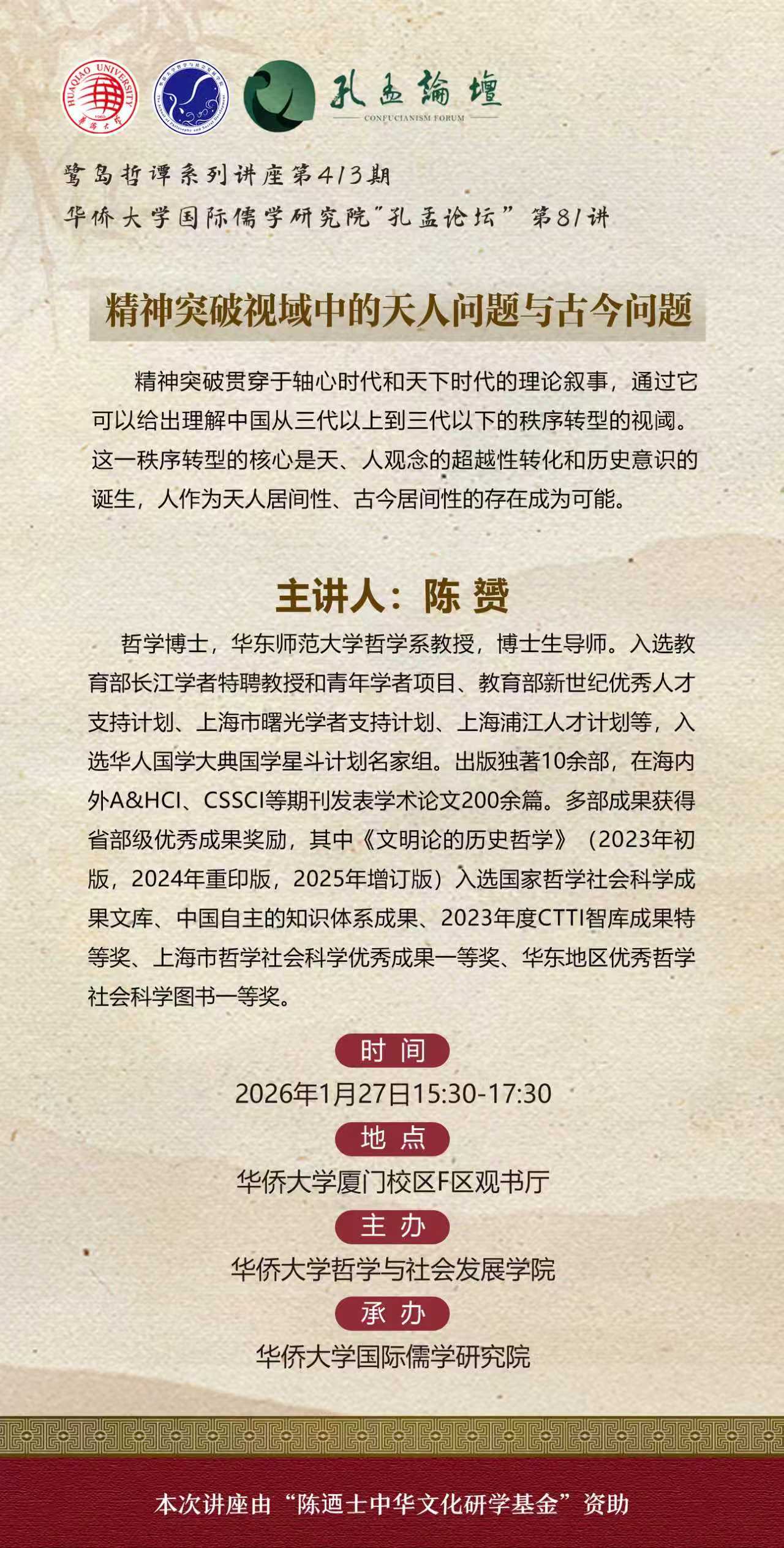 【讲座预告】77779193永利鹭岛哲谭系列讲座第413期暨国际儒学研究院“孔孟论坛”第81讲之精神突破视域中的天人问题与古今问题