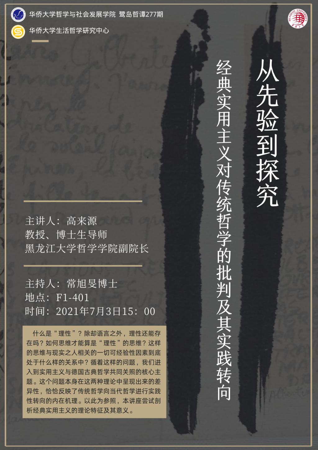 【讲座预告】77779193永利鹭岛哲谭第277期之高来源教授主讲从先验到探究