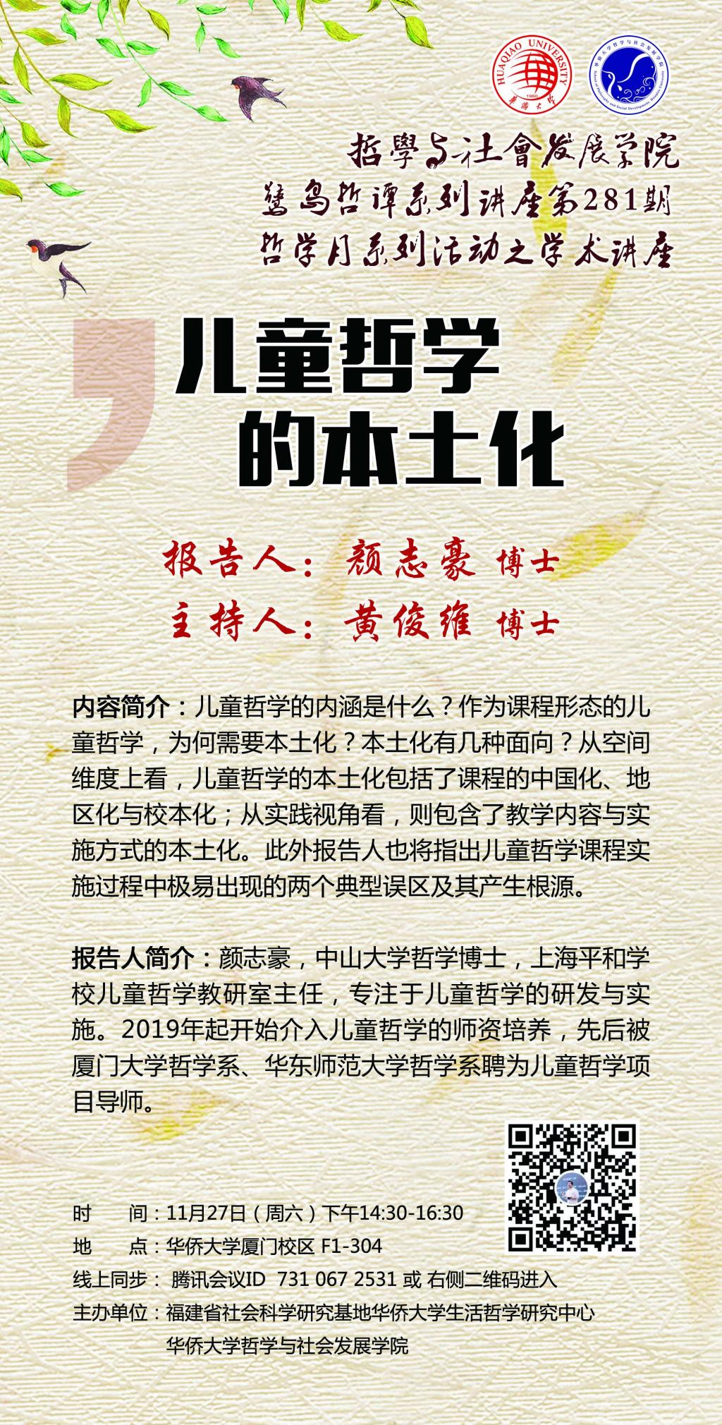 【讲座预告】77779193永利鹭岛哲谭系列讲座第281期之儿童哲学的本土化